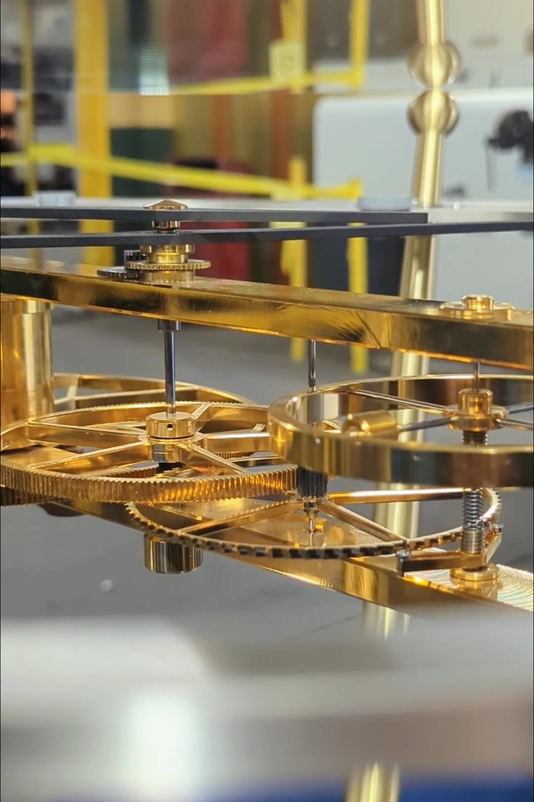 Made with brass, stainless steel, and other alloys, this work of art is engineered with precision and balance. The functioning clock mechanism is wound by hand and is plated in 18k gold. The dial of the clock is made from stainless steel plate, whereas the base is milled from solid brass. A 39” round piece of glass completes the top. Each aspect of this piece is customizable; platings include gold, platinum, rhodium, copper, rose gold, and dark ruthenium.